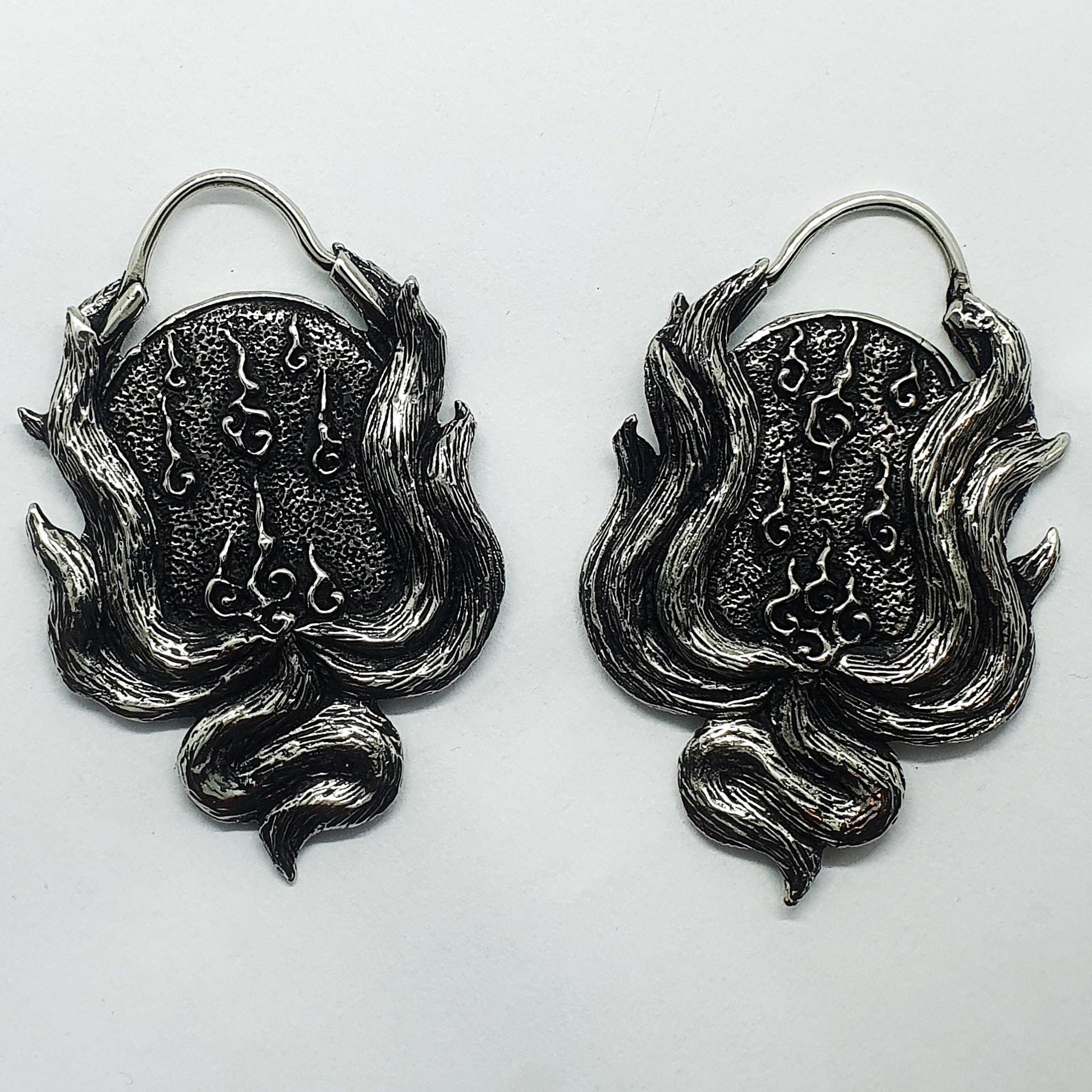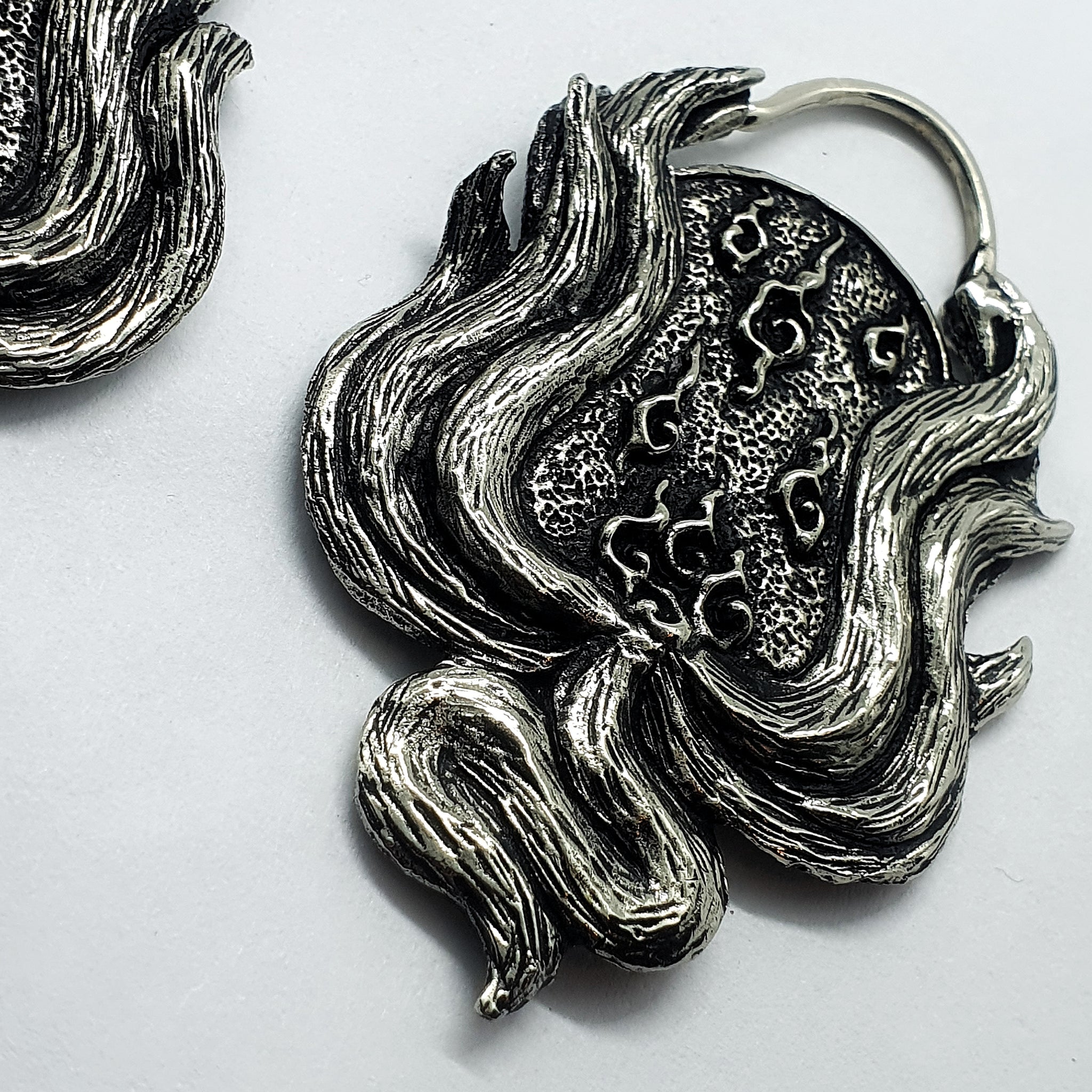 This design is inspired by the japanese legend of the Kitsune, a cunning fox spirit which, according to some stories, comes to existence when foxes turn older than twenty years, developing additional tails within the centuries. Our representation of this creature, which can also be found in many other asian cultures, comes in a slightly oval shape with nine tails encapsulating the centerpiece, a structured round plate with engraved Kitsunebis, little balls of fire the Kitsune is said to breath to light their ways.