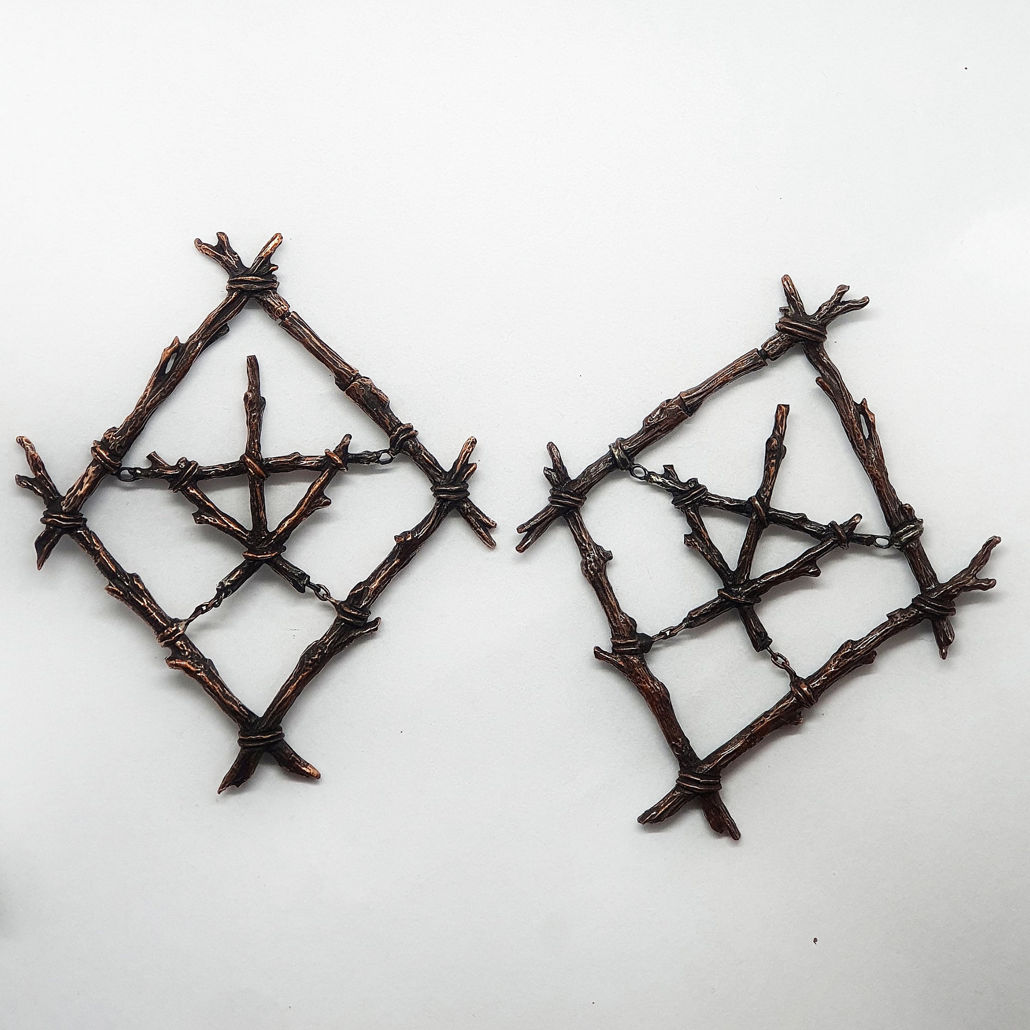Crafted from oxidized copper, these earweights draw inspiration from the haunting feeling of being in the thick of the woods, only encapsulated by silence and feeling the hairs standing up in ones neck, wondering what is lurking between the trees, unseen. They are a nod to the eerie ambiance of a certain cinematic masterpiece, a captivating blend of nature inspired design and rustic elegance. The dark patina of the copper enhances the detailed silhouette of the stickman figures, reminescent of ancient artifacts discovered in places long forgotten.