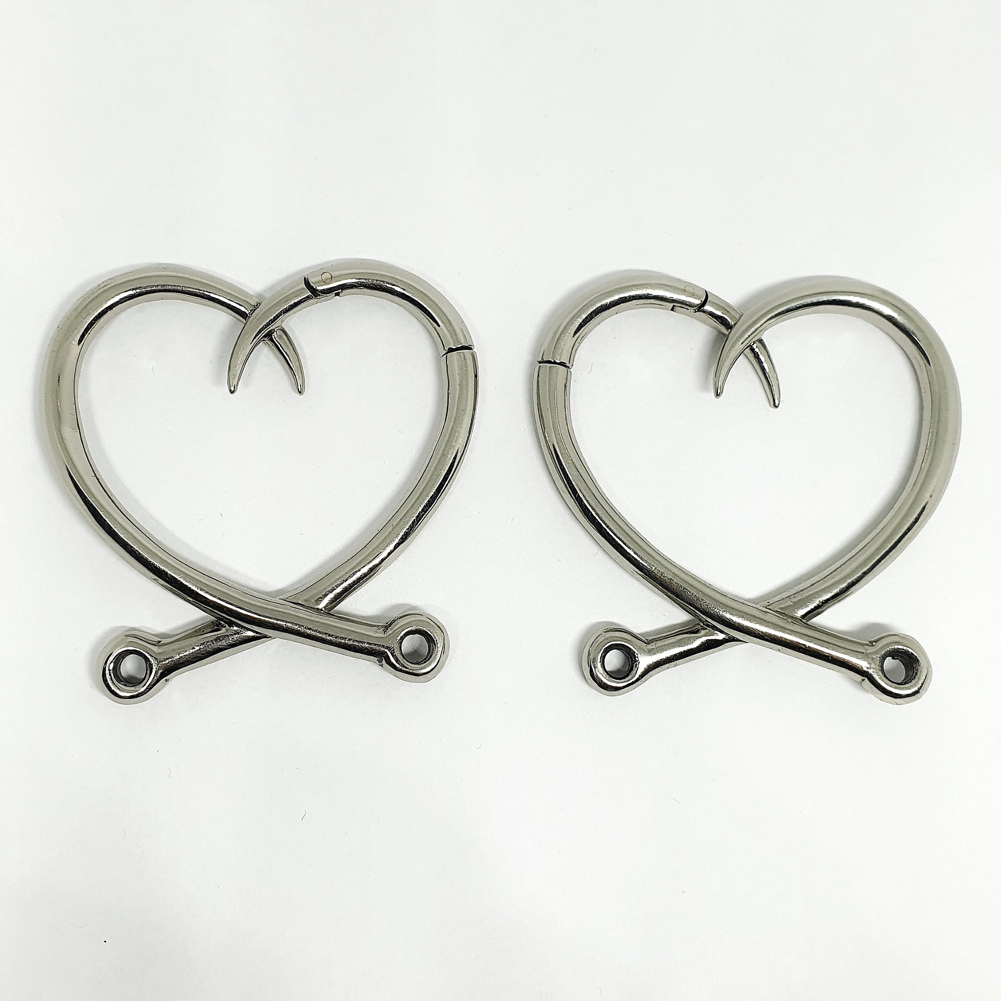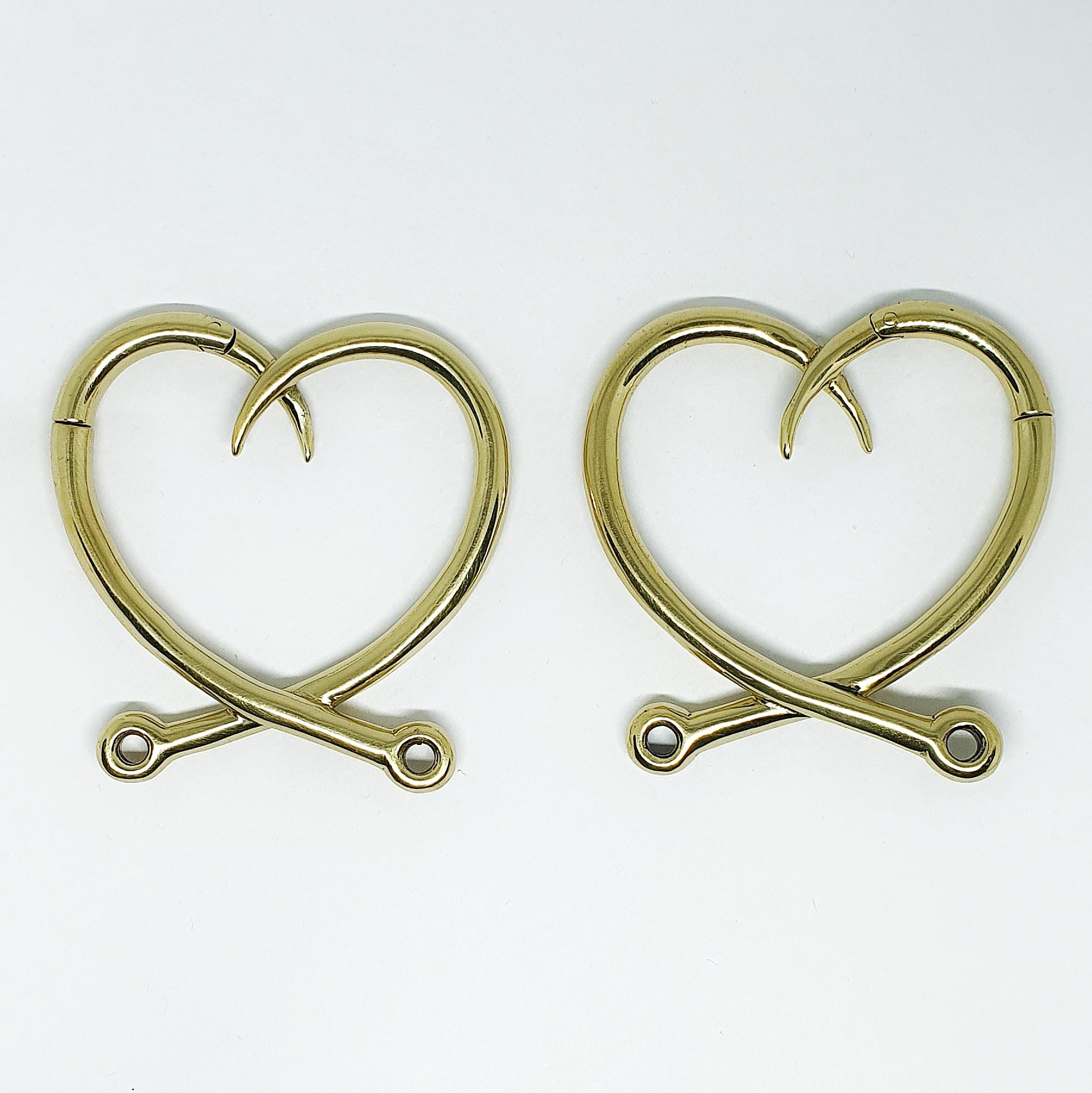 This one goes out to the suspension community - two hooks ready to be placed into tender flesh, crossed over each other akin to a love-heart. Coming with a hinged opening and available in white brass and yellow brass, those hoops are a statement piece and loveletter to your passion and the modern primitive movement.