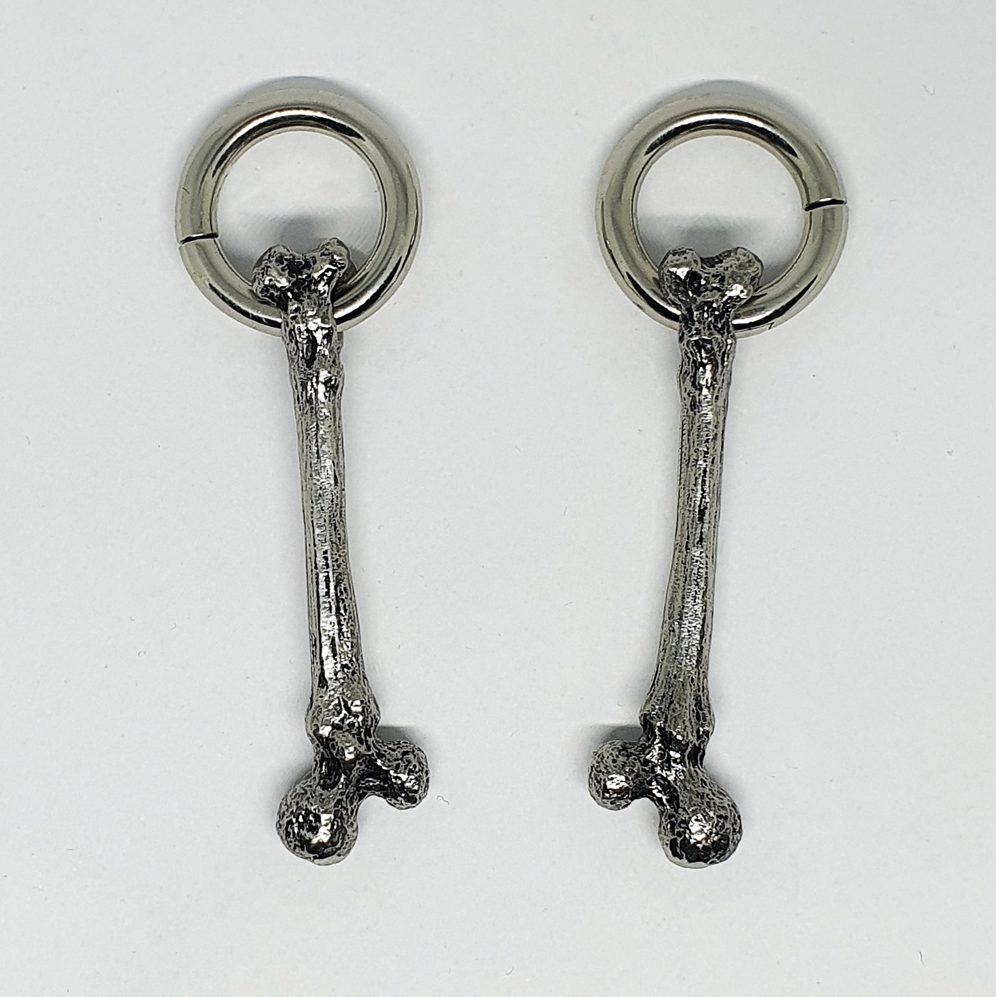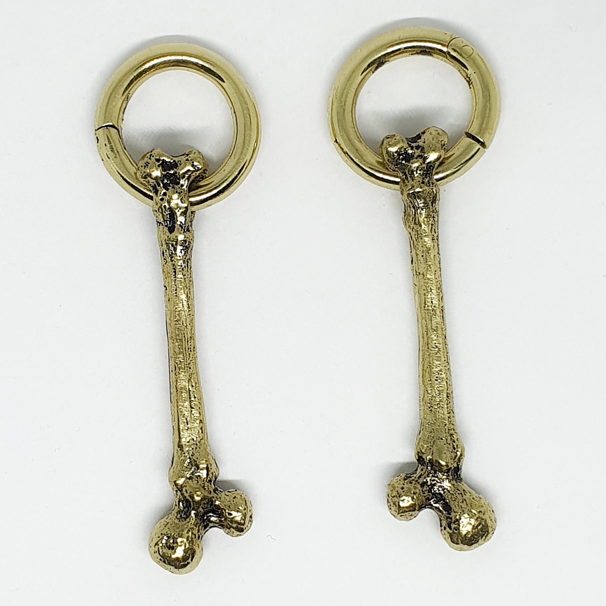 Inspired by the myth of their namesake La Huesera, these Earweights come with the simple premise of a pair of bones suspended on a thick hinged ring, while being a well of symbolism. Rooted in folklore, the enigmatic spirit of the Bone Woman gathers bones in the desert until she has a full skeleton, to bring it back to life with her song.