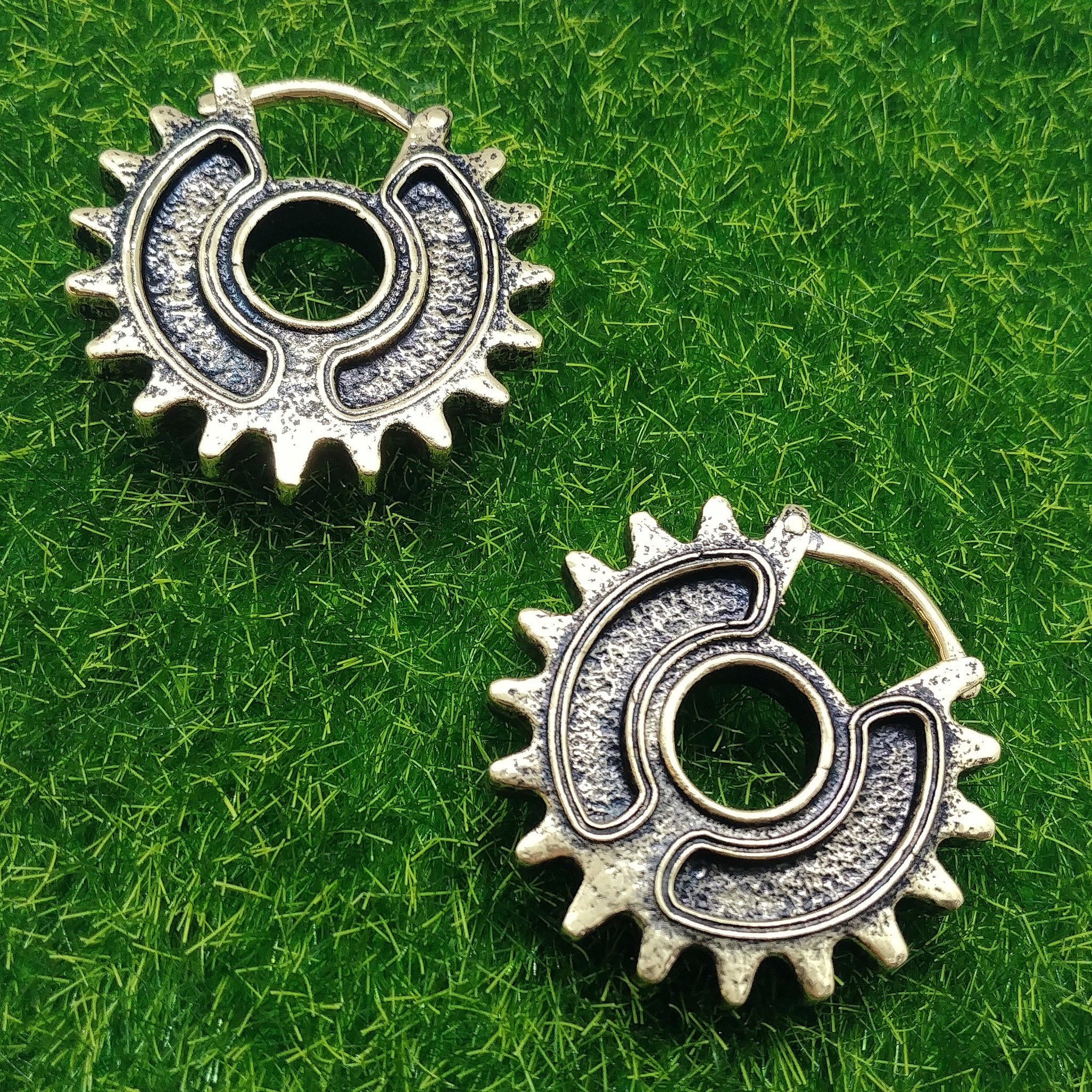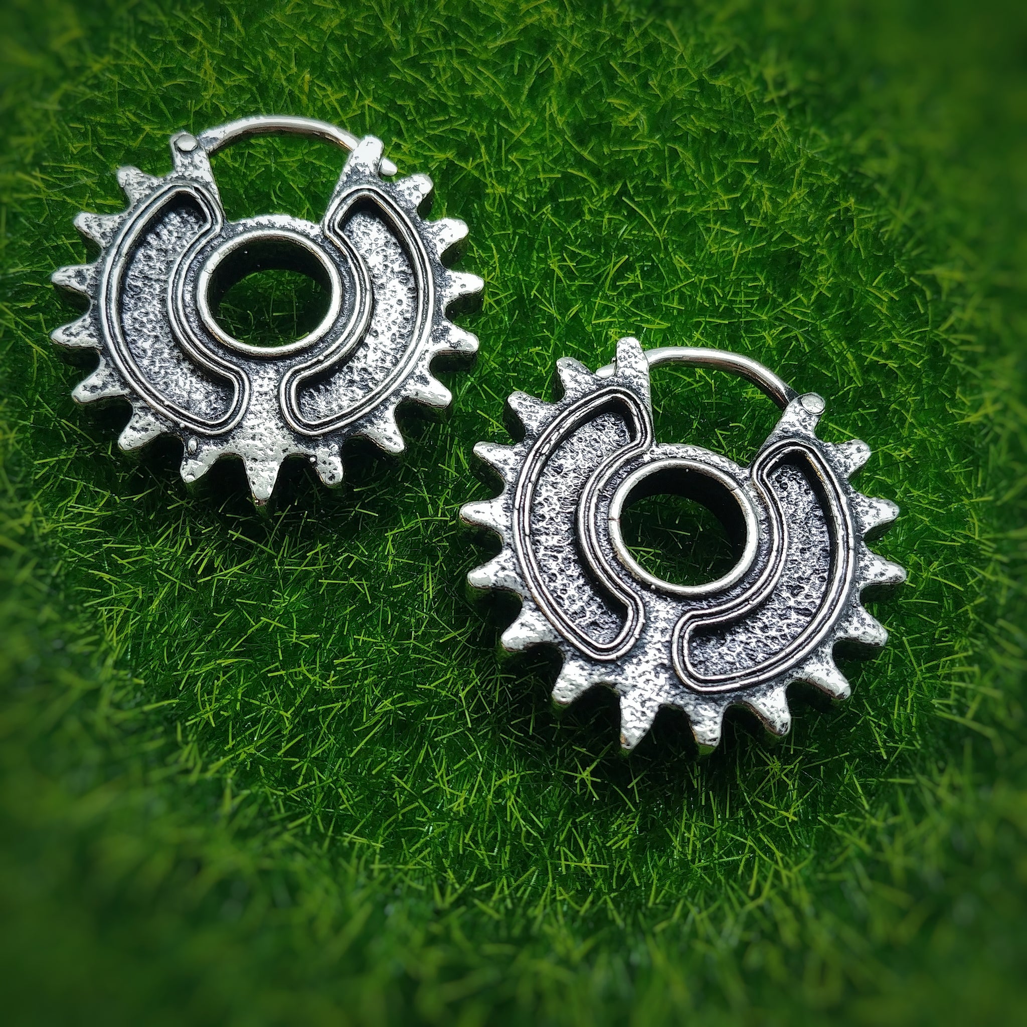 Crafted with great detail for those who requested a more subtle version of our signature Design "The Scavenger Queen" to add to their junkpunk aesthetics. Mimicing the intricate gears of a bicycle, the Baby Scavengers remind us of distopian futures in a deserted world, where people take what they find in the remains of civilisation to adorn themselves for a firece look.