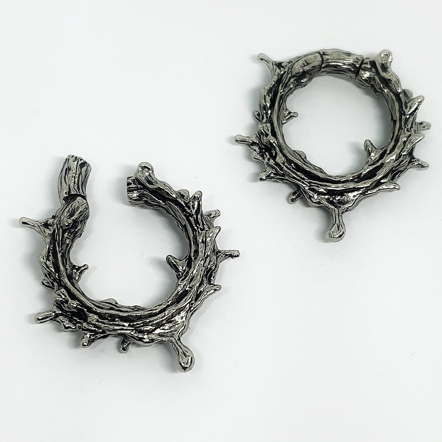 A more pronounced and larger version of our hybris earweights, the Crown of Gold is inspired by the art of memento mori. These hoops are shaped like the are melting in all directions to look like dripping gold or an illusion falling apart, inspired by the idea of material riches and aspirations being a temporary treasure or even leading to hubris.